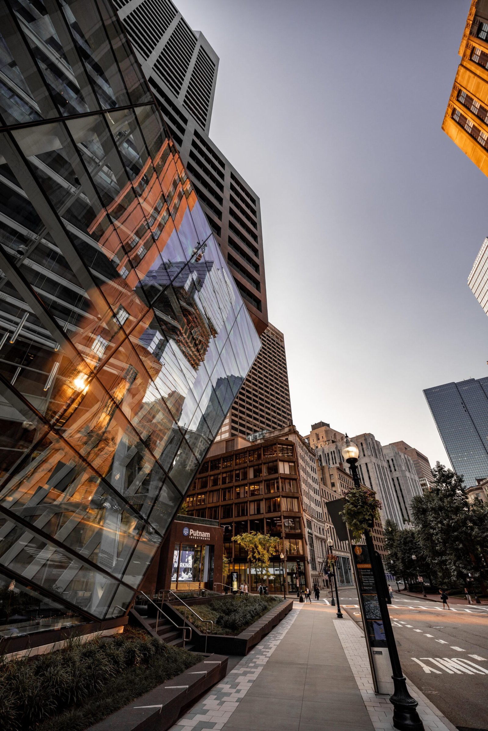 Die Perspektive: Urbane Dynamik trifft auf architektonische Perfektion. Die steile Perspektive entlang der Glasfassade bricht die Realität auf und spiegelt die historische Seele Bostons in der modernen Oberfläche wider. Ein Bild voller Linien, Reflexionen und dem kühlen Licht eines Morgens in Neuengland. Es verkörpert den Puls der Stadt und die ständige Transformation von Alt zu Neu.