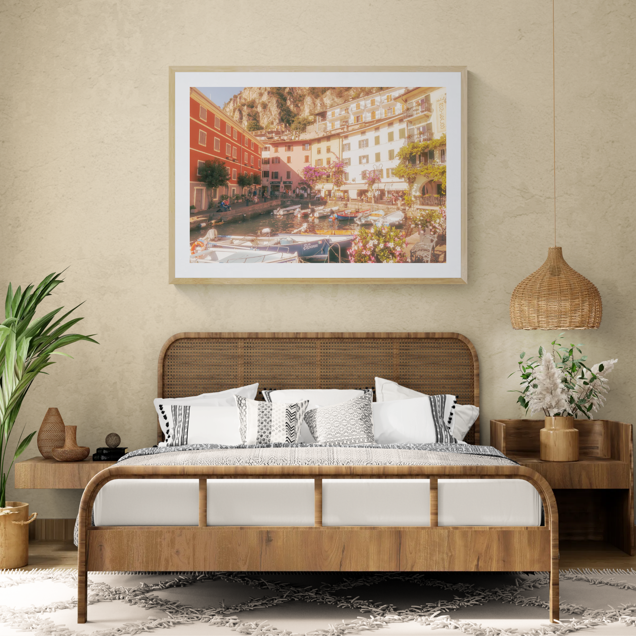 Die Perspektive: Die warme Nachmittagssonne taucht die Fassaden von Limone in ein sanftes, fast goldenes Licht. Zwischen den blühenden Bougainvilleen und den im Hafenbecken schaukelnden Booten scheint die Zeit stillzustehen. Dieses Werk fängt die lebendige Textur und das besondere Flair eines der ikonischsten Orte am Gardasee ein – ein Moment vollkommener mediterraner Harmonie.