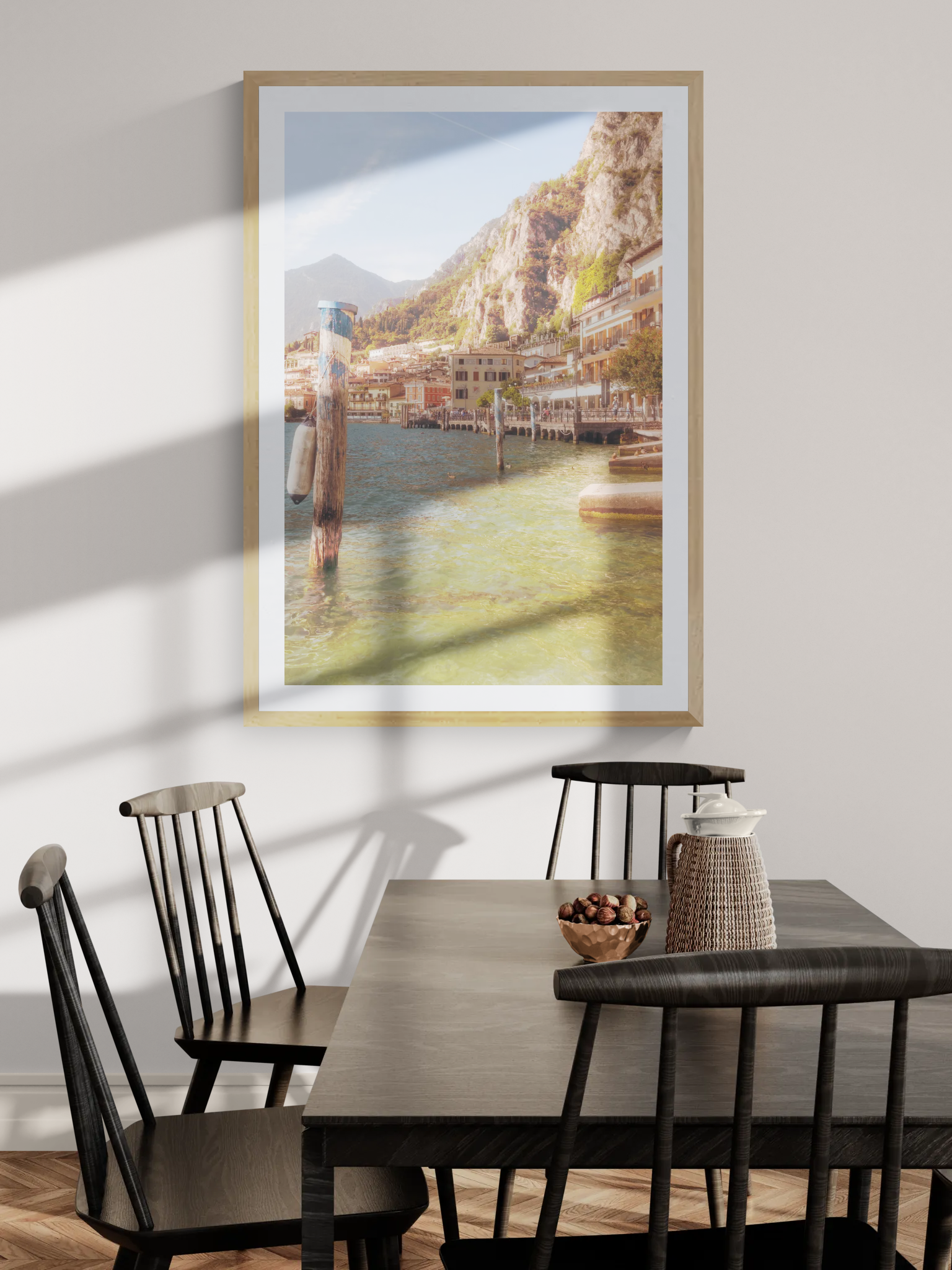 Die Perspektive: Der Blick streift über die sanften Wellen des Gardasees, vorbei an den Holzpfählen, die seit Jahrzehnten den Rhythmus des Wassers kennen. Im Hintergrund erhebt sich Limone – ein Ort, der wie kein anderer die Verbindung zwischen schroffen Felswänden und mediterraner Leichtigkeit verkörpert. Dieses Bild fängt die Klarheit und die frische Brise eines Morgens am See ein.