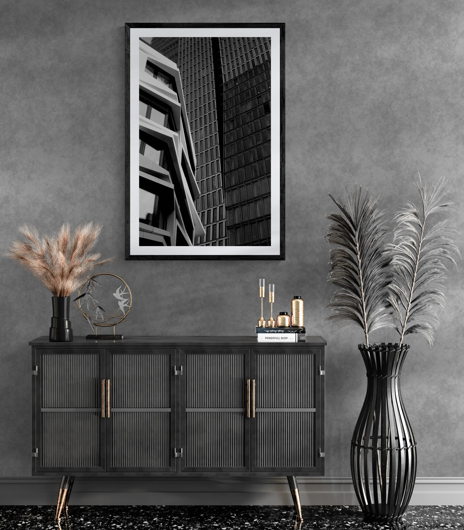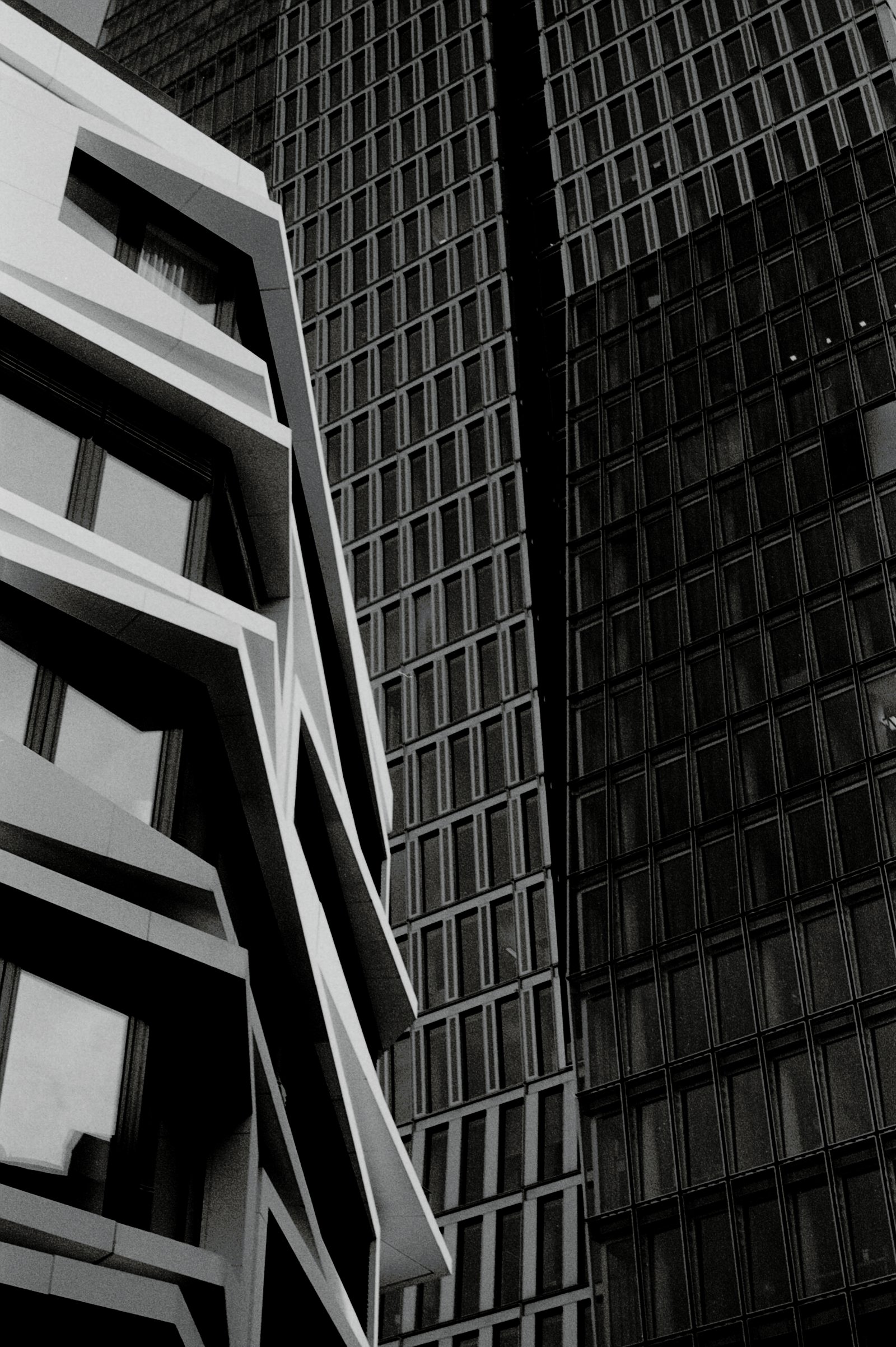 Die Perspektive: Dieses Werk ist eine Hommage an die Entschleunigung. Aufgenommen mit einer analogen Mamiya RZ67 auf echtem Film, fängt es die Frankfurter Skyline in einer harten, kontrastreichen Schwarz-Weiß-Ästhetik ein. Die Komposition spielt mit der massiven Präsenz unterschiedlicher Fassadenstrukturen, die sich wie tektonische Platten ineinander schieben.