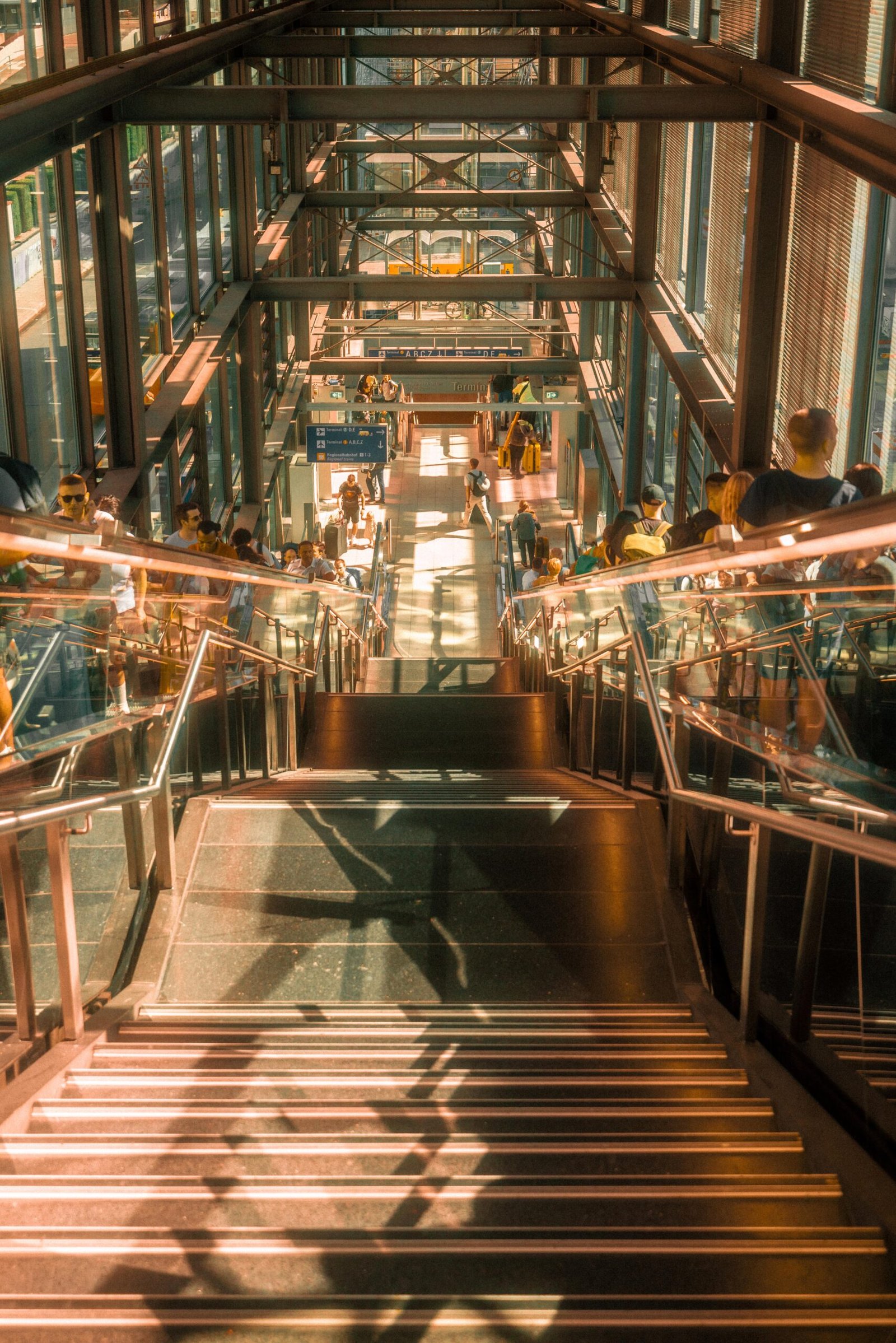 Die Perspektive: Frankfurt am Main ist das Tor zur Welt, doch selten halten wir inne, um die geometrische Schönheit seiner Transiträume zu bewundern. Diese Aufnahme entstand an einem jener Tage, an denen das Sonnenlicht tief durch die Glasfassaden bricht und die harte Stahlkonstruktion des Flughafens in ein warmes, fast nostalgisches Licht taucht.
