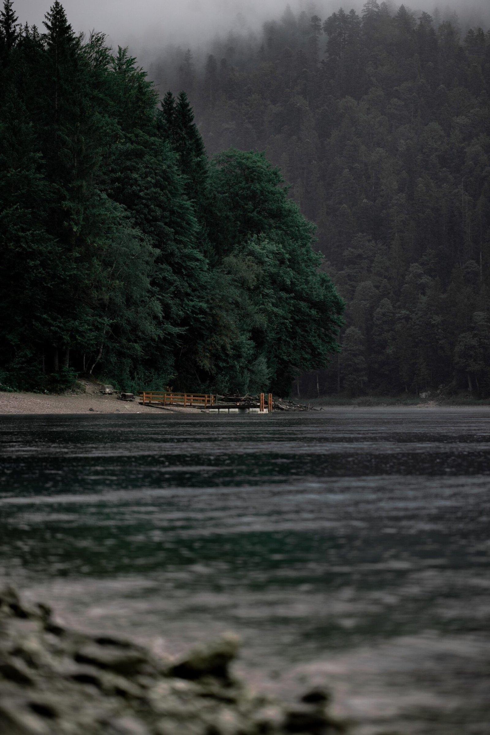Die Perspektive: Melancholisch, ruhig und tiefenentspannt. Der Regenschauer hüllt den Eibsee in eine dichte, geheimnisvolle Atmosphäre. Die Wasseroberfläche ist aufgeraut vom Regen, während die tiefdunklen Tannenwälder im dichten Nebel verschwinden. Der schlichte Holzsteg ragt wie ein unerschütterlicher Anker in die graugrüne Flut und lädt dazu ein, dem fernen Prasseln der Tropfen zu lauschen. Ein Bild, das die Gemütlichkeit und die zeitlose Kraft der Natur feiert.