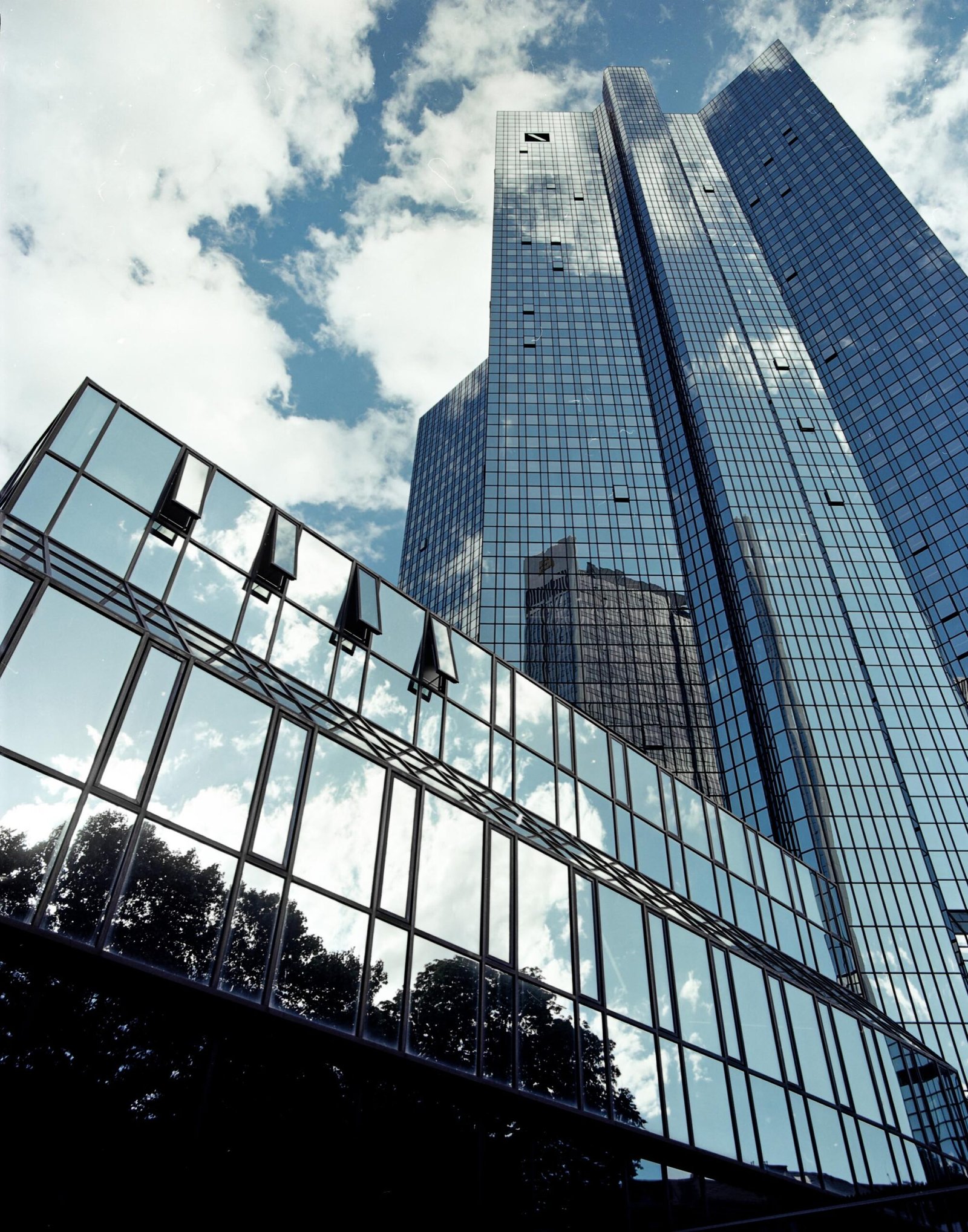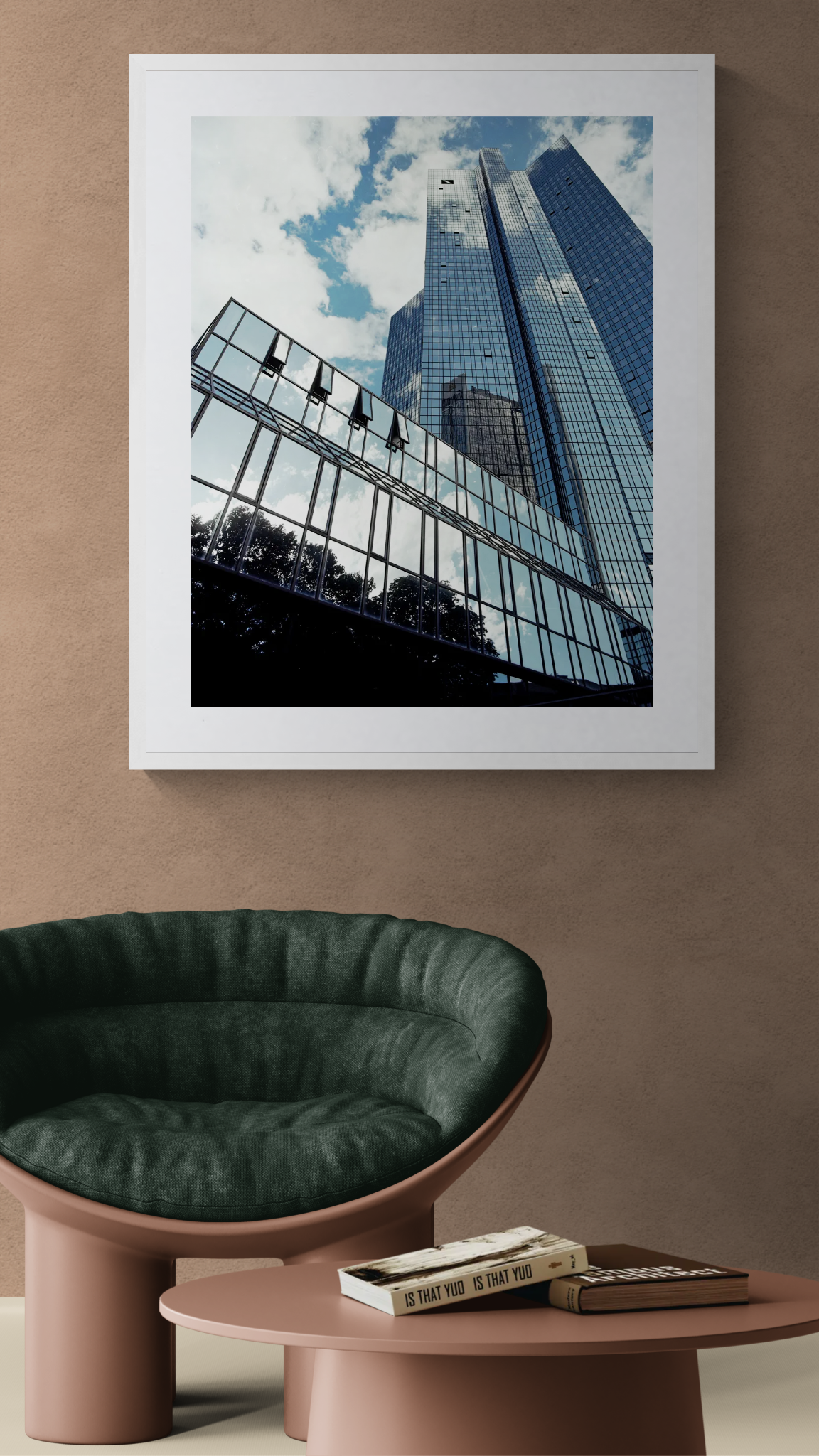 Die Perspektive: Kühle Eleganz und architektonische Dominanz. Die gläserne Fassade der Deutsche Bank Zwillingstürme schneidet wie ein Monolith in den Frankfurter Himmel, während sich die Wolken in der unendlichen Glasfläche spiegeln. Ein Bild, das Präzision, Fortschritt und die beeindruckende Symmetrie moderner Hochhausarchitektur feiert.