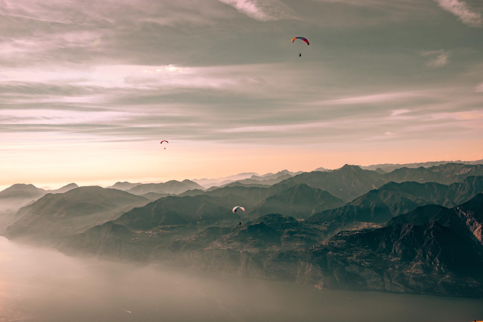 Die Perspektive: Grenzenlose Freiheit über den Gipfeln Norditaliens. Der Blick schweift über die schroffen Silhouetten der Alpen, die im sanften Dunst des Abends mit dem Wasser des Gardasees verschmelzen. Die winzigen Farbtupfer der Gleitschirme in der unendlichen Weite des Himmels verleihen dem Bild eine Dynamik, die Fernweh und Abenteuerlust weckt.